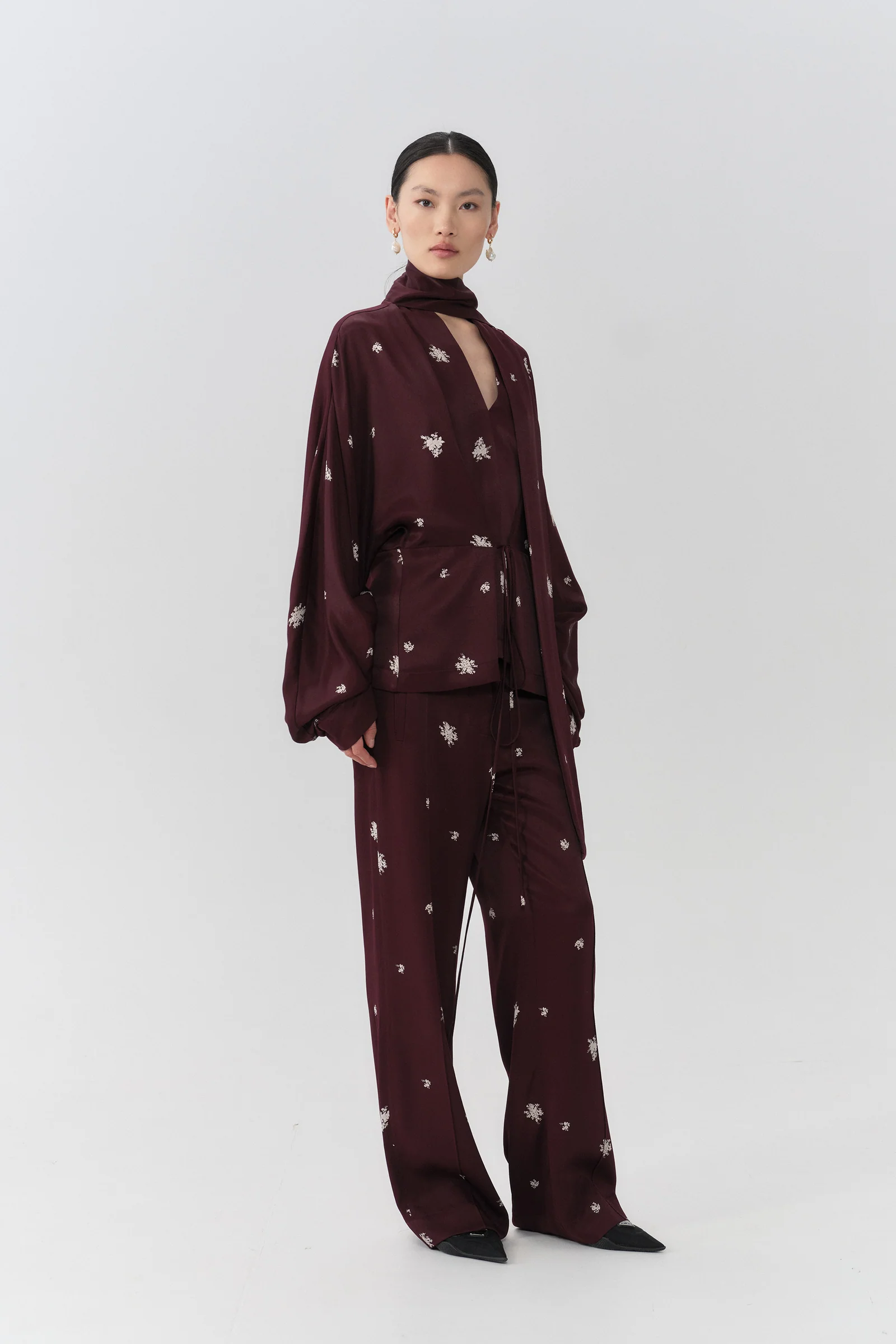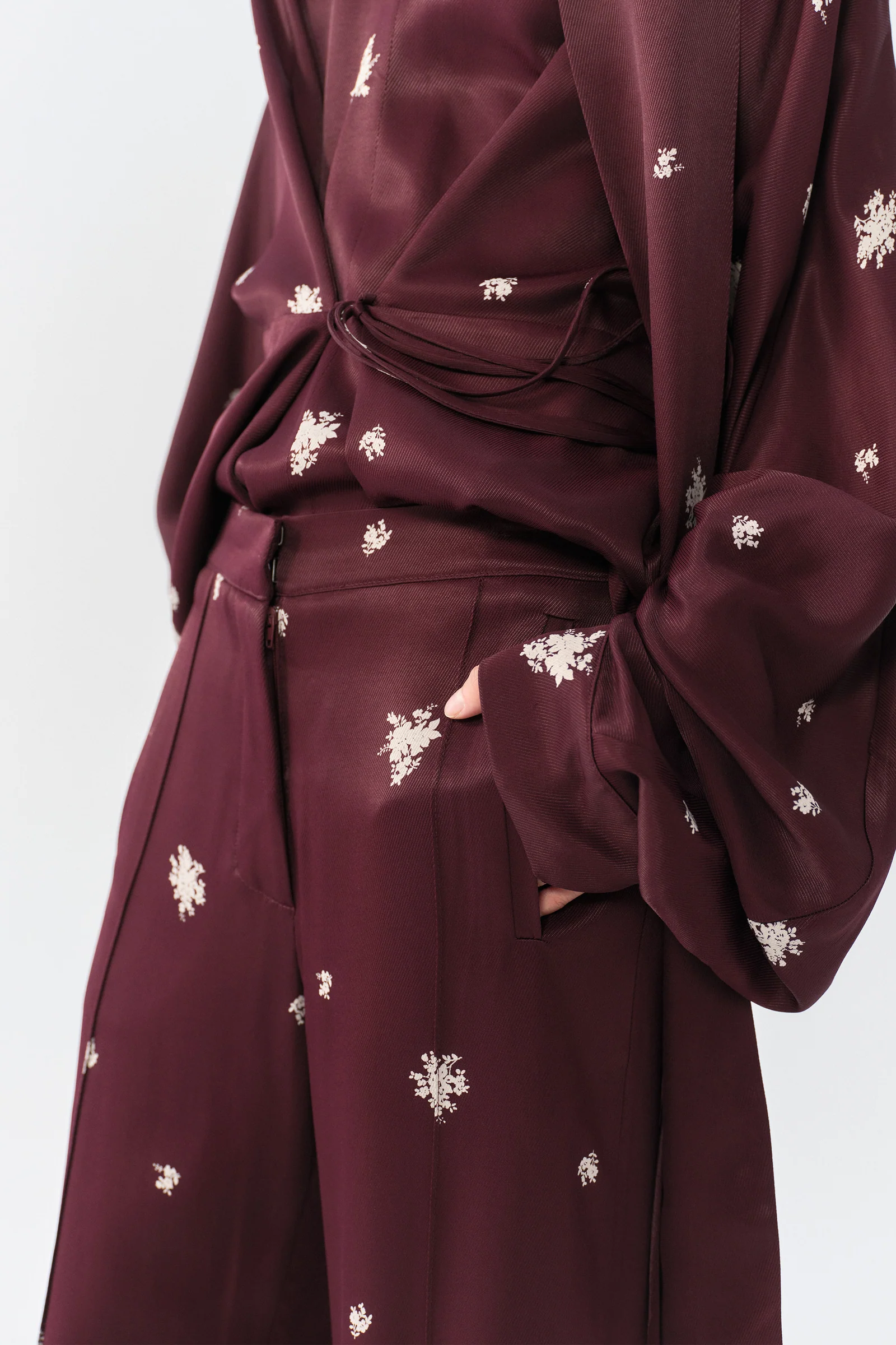 Prabangios kelnės vyšnių spalvos, dekoruotos dramblio kaulo atspalvio floristiniais motyvais.