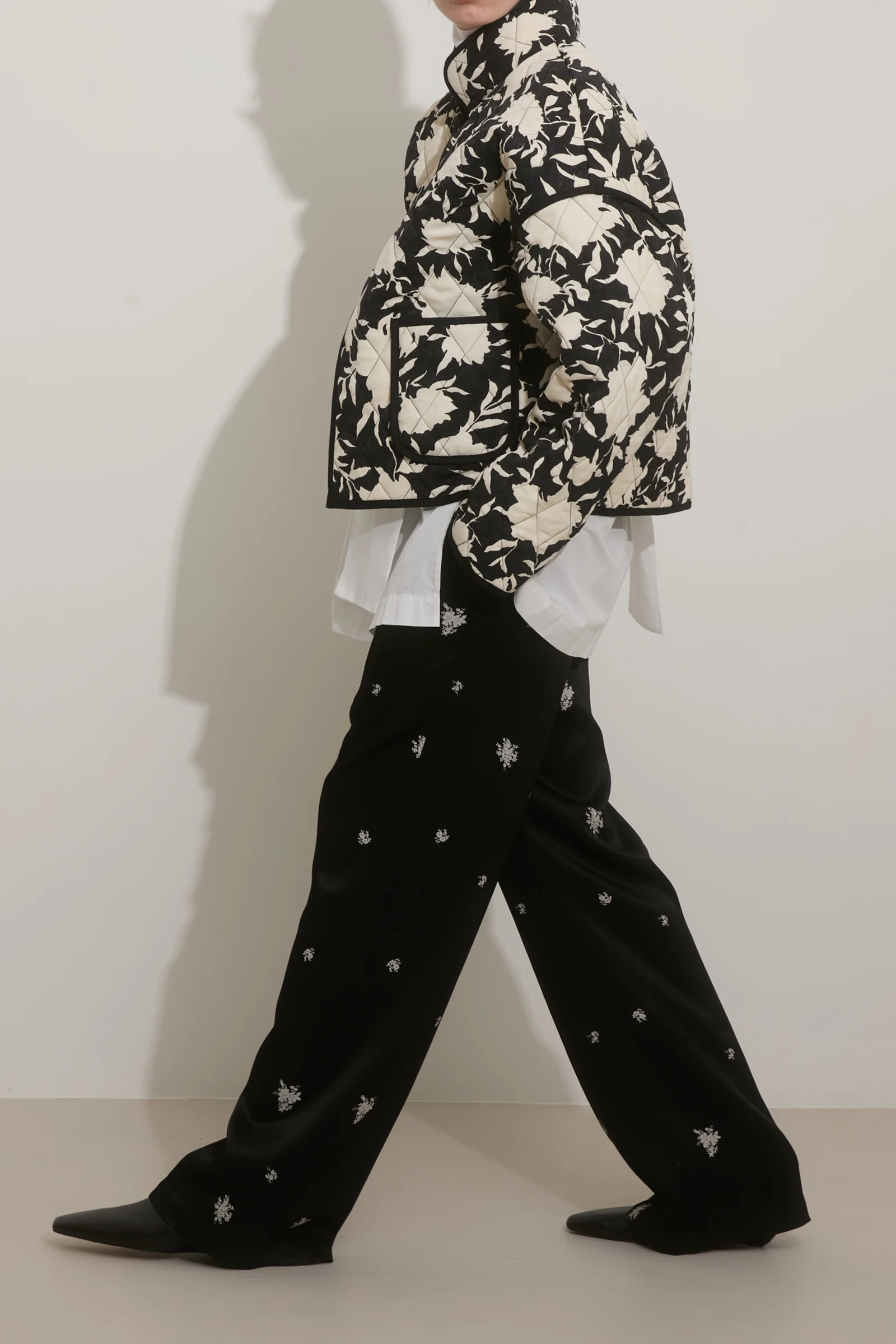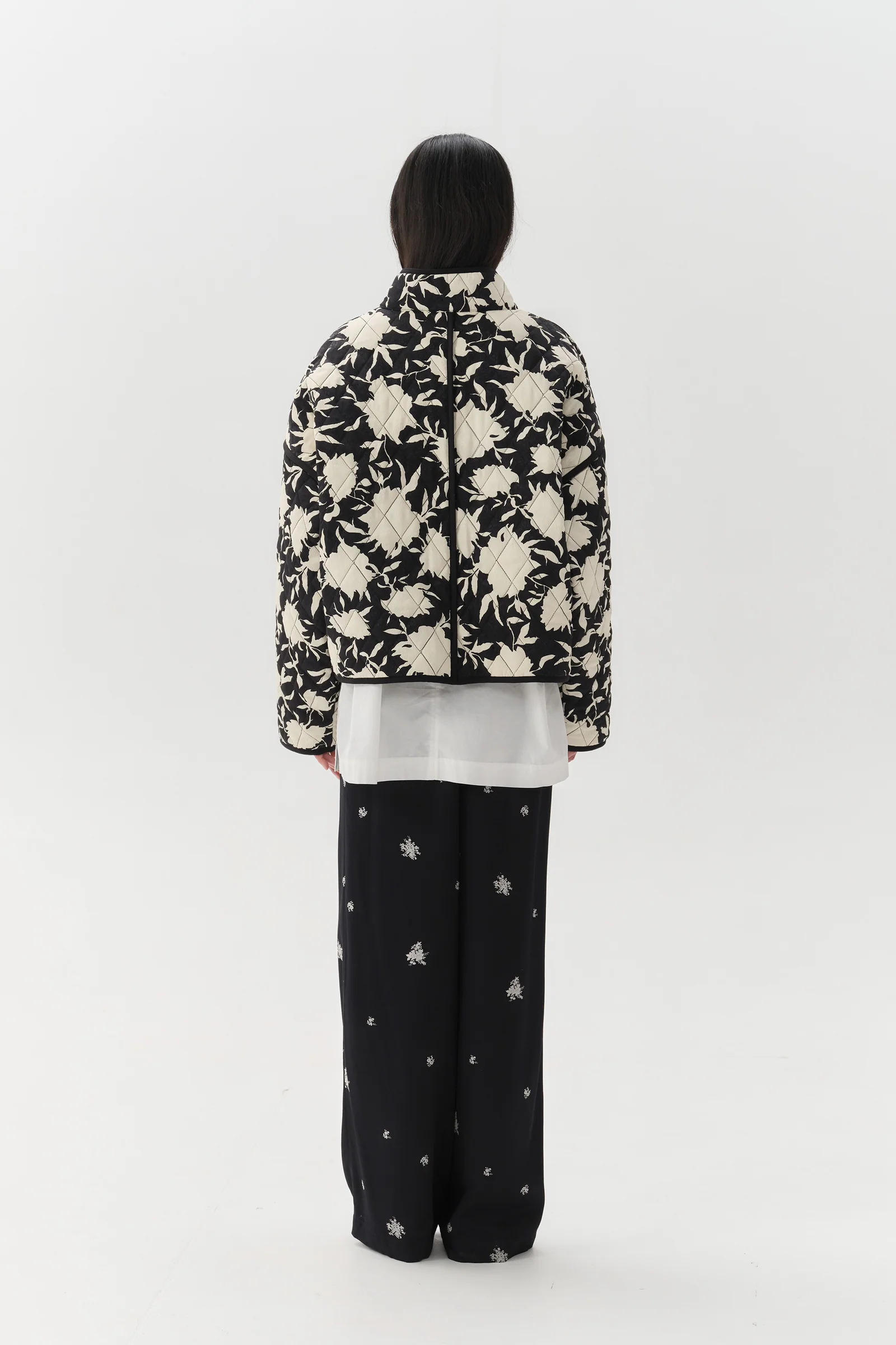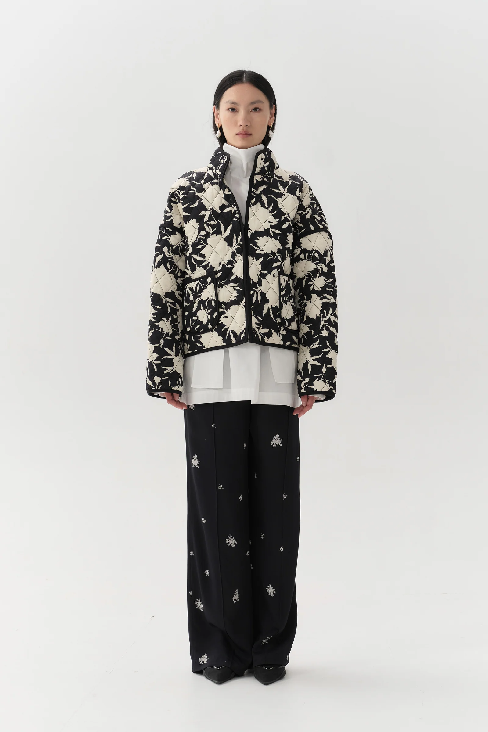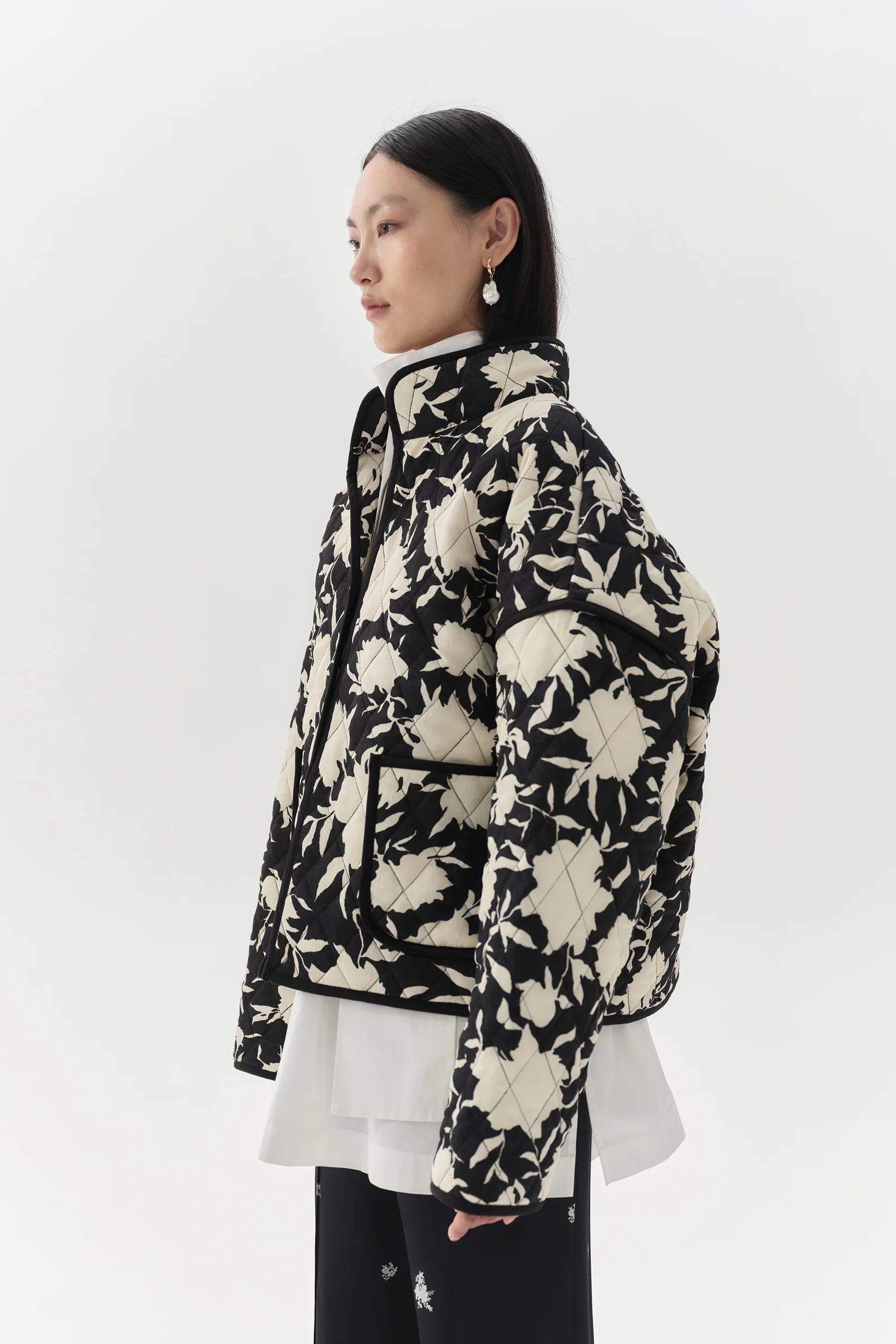 Dygsniuotas švarkas iš išskirtinės tekstūros žakardinio audinio, papildytas kontrastingais juodais kantais.