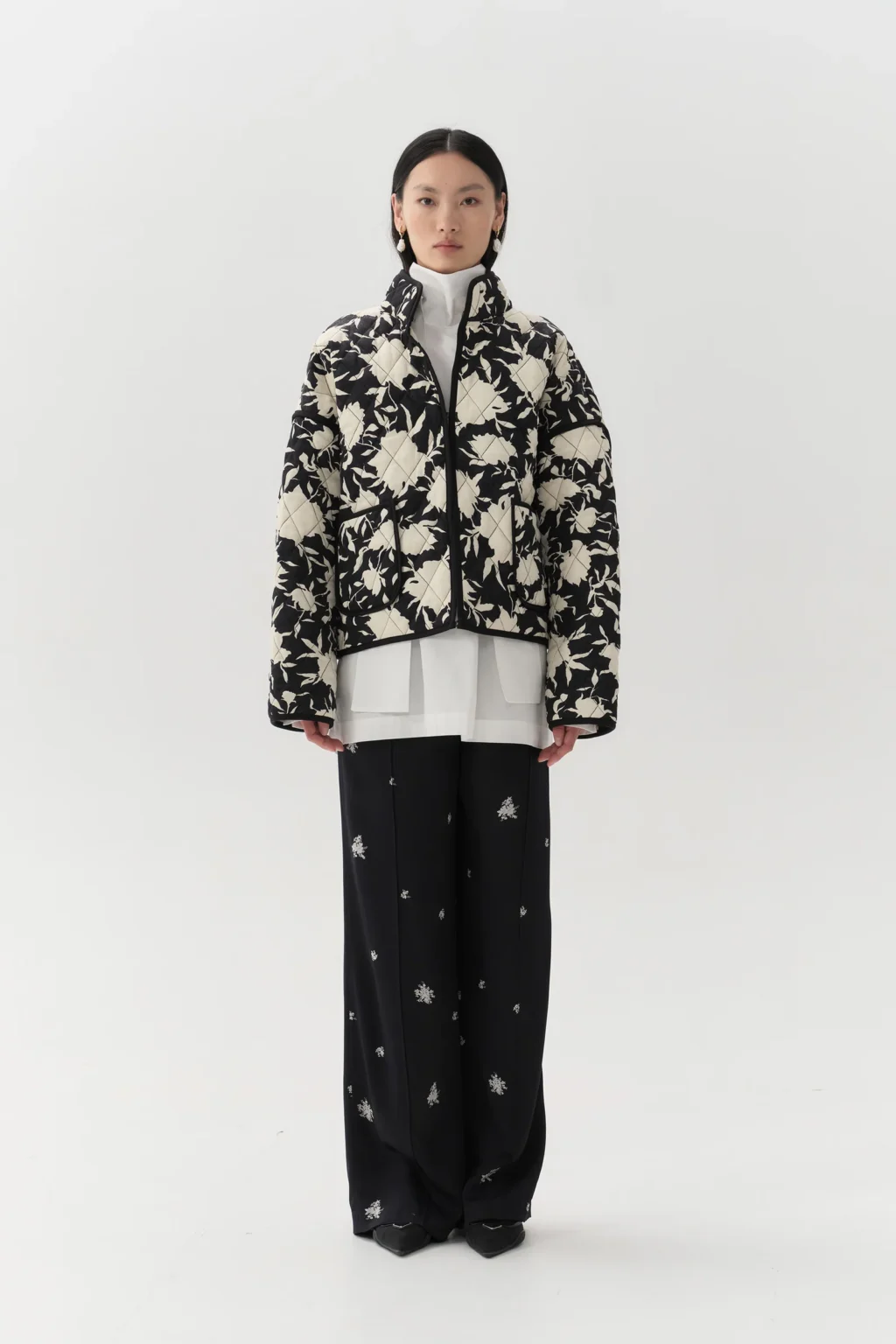 Dygsniuotas švarkas iš išskirtinės tekstūros žakardinio audinio, papildytas kontrastingais juodais kantais.