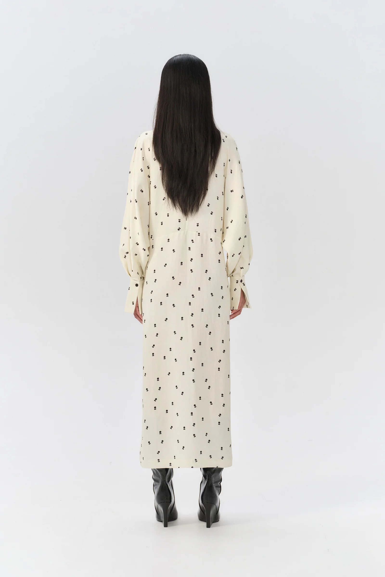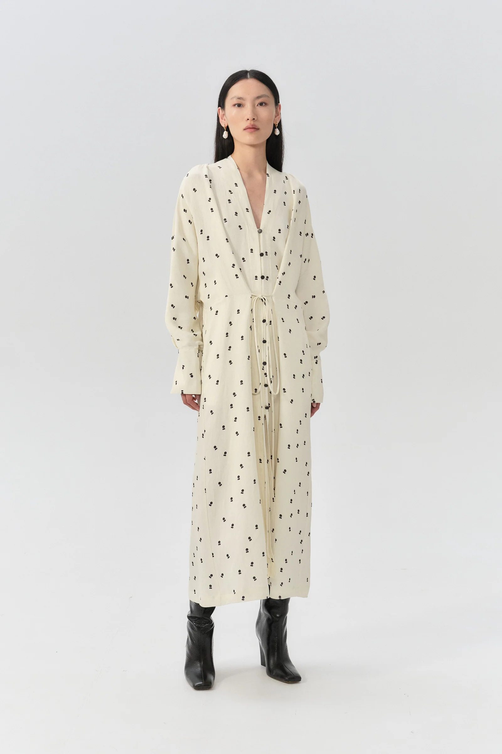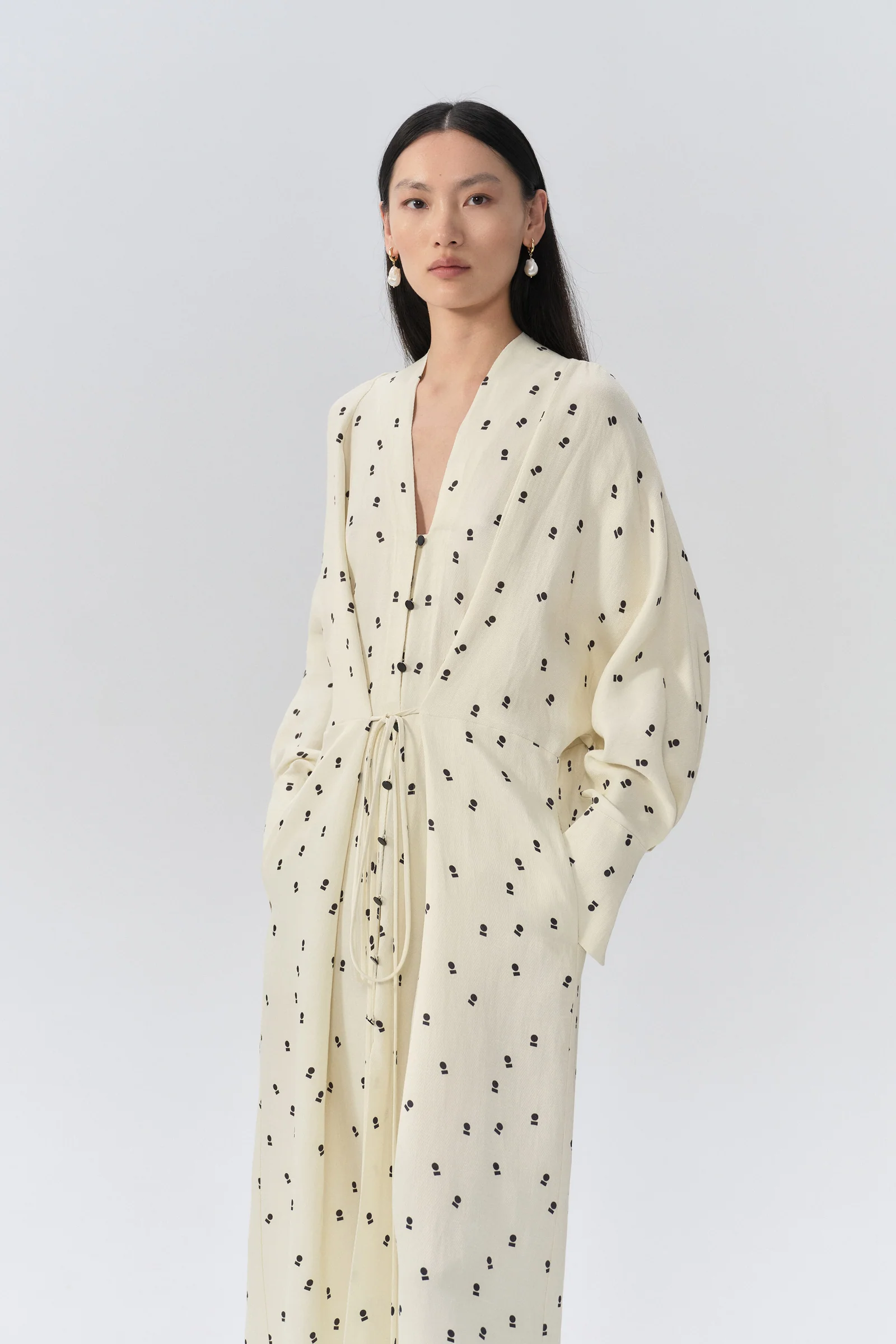 Kimono stiliaus suknelė iš viskozės ir lino audinio. Modelis su V formos iškirpte, užsegimu sagomis priekyje, ilgomis kimono rankovėmis ir lengvai parauktais rankogaliais.