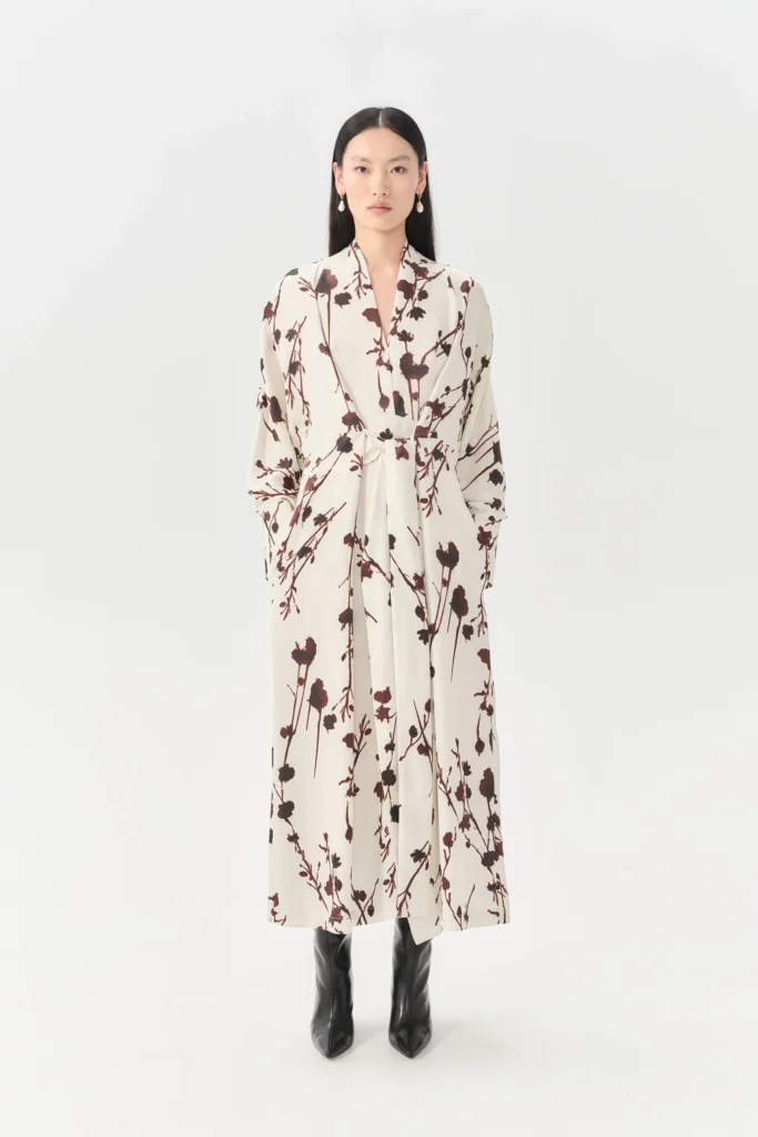 Kimono stiliaus suknelė iš viskozės ir lino audinio. Modelis su V formos iškirpte, užsegimu sagomis priekyje, ilgomis kimono rankovėmis ir lengvai parauktais rankogaliais.
